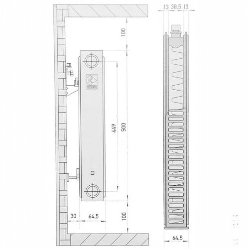 Теплоотдача при t = 70°С - 1131 Вт. Объем воды - 4,05 л. Вес - 22,95 кг. Температура теплоносителя - до 100 °С.
