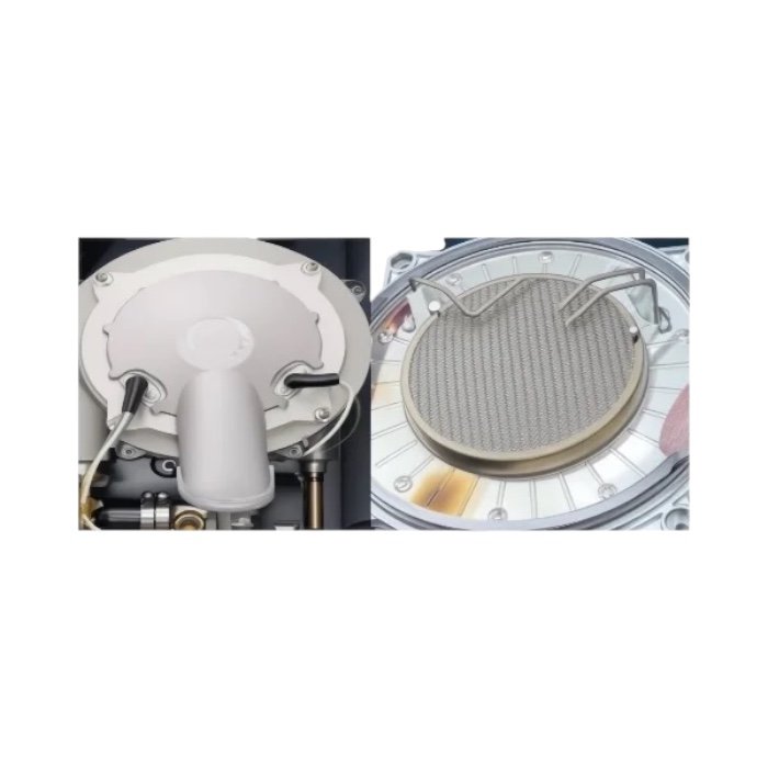 На окрему увагу заслуговує система попереднього змішування газу та повітря: вентилятор створює однорідну суміш, яка горить рівномірно та безпечно. Горіння відбувається на металевій волоконній сітці в інфрачервоному спектрі, що знижує рівень викидів CO і NOx. Котел відповідає екологічним стандартам 5-6 класів.