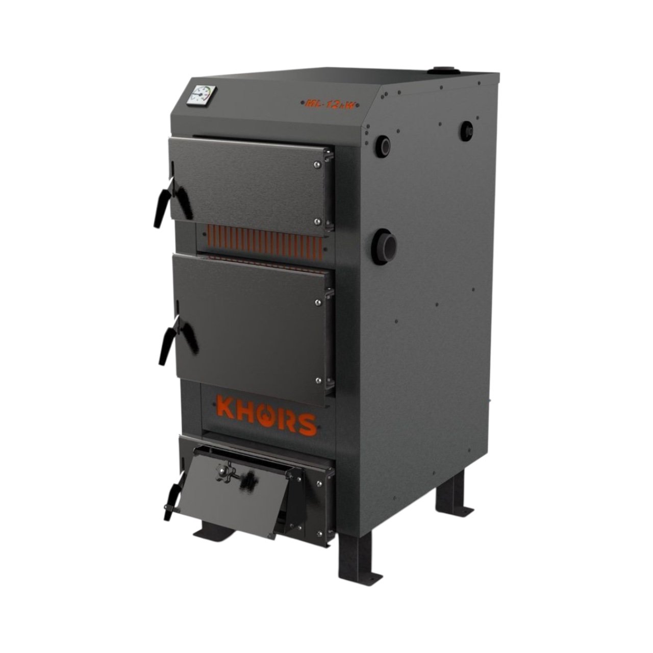 Твердопаливні котли KHORS ML тривалого горіння є універсальним котлом з комбінованим трьох ходовим теплообмінником, тобто гарячі гази на шляху до димаря огинають полиці та труби наповнені водою. Вентилятор монтується на фланець вертикального повітроводу. Прогріте повітря надходить над чавунним колосником через форсунку безпосередньо в зону горіння, покращуючи процес. Підтримка температури котла передбачає місце, куди підключається механічний регулятор тяги. Регулятор тяги монтується в праву стінку котла та керує гравітаційною заслінкою за допомогою ланцюжка, відкриваючи та закриваючи її. Повітря кисень надходить під чавунний колосник у зольник і потім камеру горіння. Мають велику завантажувальну камеру і високий ККД. Працюють у системах опалення з природною, відкритою системою та примусовою закритою системою циркуляцією води з максимальним робочим тиском до 0,2 МПа. Одне завантаження забезпечує від 4 до 7 годин горіння, залежить від палива, його укладання та системи опалення. Паливо, що рекомендується, дерево твердих порід, а також відходи дерева, брикети з дерева і торфу, картон, тріска, пелети, вугілля. Для запобігання розмерзанню системи передбачено вихід під ТЕН як резервне джерело енергії.