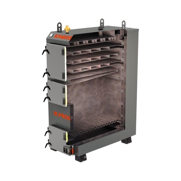 Твердопаливні котли KHORS M prom 50 кВт тривалого горіння є універсальним котлом з комбінованим трьох ходовим теплообмінником, тобто гарячі гази на шляху до димаря огинають полиці та труби наповнені водою. Вентилятор монтується на фланець вертикального повітроводу. Прогріте повітря надходить над чавунним колосником через форсунку безпосередньо в зону горіння, покращуючи процес. Підтримка температури котла передбачає місце, куди підключається механічний регулятор тяги. Регулятор тяги монтується в праву стінку котла та керує гравітаційною заслінкою за допомогою ланцюжка, відкриваючи та закриваючи її. Повітря кисень надходить під чавунний колосник у зольник і потім камеру горіння. Мають велику завантажувальну камеру і високий ККД. Працюють у системах опалення з природною, відкритою системою та примусовою закритою системою циркуляцією води з максимальним робочим тиском до 0,2 МПа. Одне завантаження забезпечує від 4 до 7 годин горіння, залежить від палива, його укладання та системи опалення. Паливо, що рекомендується, дерево твердих порід, а також відходи дерева, брикети з дерева і торфу, картон, тріска, пелети, вугілля. Для запобігання розмерзанню системи передбачено вихід під ТЕН як резервне джерело енергії.