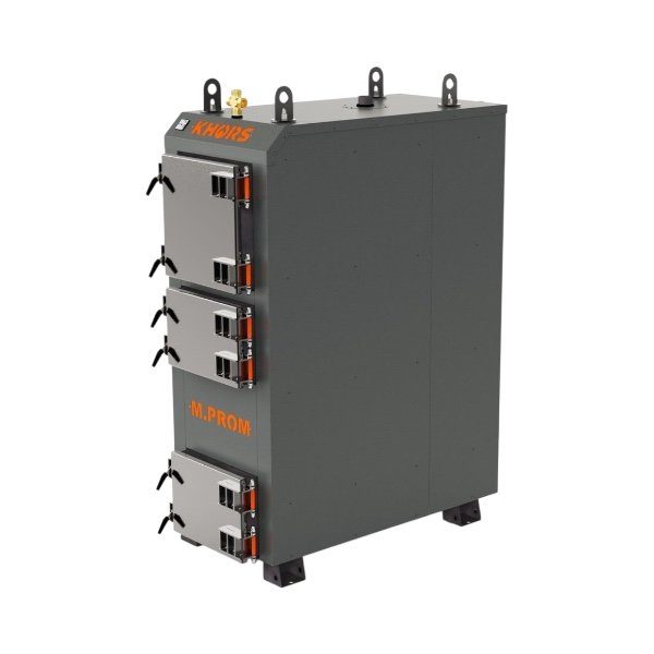Твердопаливні котли KHORS M prom 70 кВт тривалого горіння є універсальним котлом з комбінованим трьох ходовим теплообмінником, тобто гарячі гази на шляху до димаря огинають полиці та труби наповнені водою. Вентилятор монтується на фланець вертикального повітроводу. Прогріте повітря надходить над чавунним колосником через форсунку безпосередньо в зону горіння, покращуючи процес. Підтримка температури котла передбачає місце, куди підключається механічний регулятор тяги. Регулятор тяги монтується в праву стінку котла та керує гравітаційною заслінкою за допомогою ланцюжка, відкриваючи та закриваючи її. Повітря кисень надходить під чавунний колосник у зольник і потім камеру горіння. Мають велику завантажувальну камеру і високий ККД. Працюють у системах опалення з природною, відкритою системою та примусовою закритою системою циркуляцією води з максимальним робочим тиском до 0,2 МПа. Одне завантаження забезпечує від 4 до 7 годин горіння, залежить від палива, його укладання та системи опалення. Паливо, що рекомендується, дерево твердих порід, а також відходи дерева, брикети з дерева і торфу, картон, тріска, пелети, вугілля. Для запобігання розмерзанню системи передбачено вихід під ТЕН як резервне джерело енергії.
