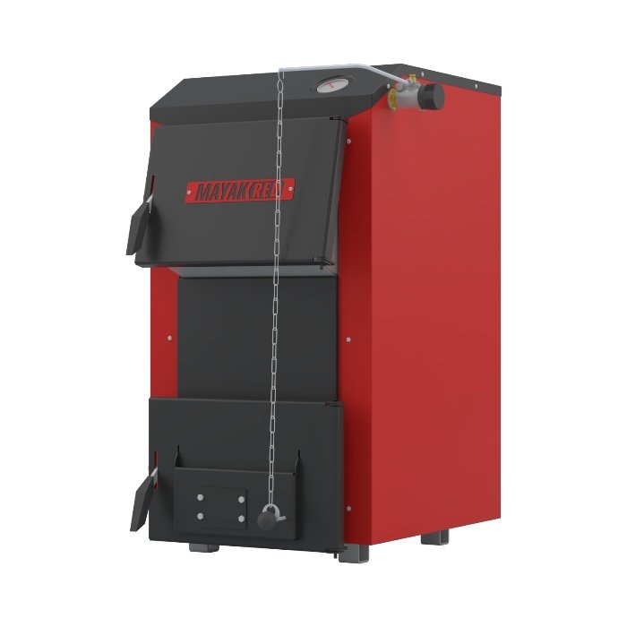 Для ізоляції корпусу казана використовується шар високотемпературної мінеральної вати. Це дозволяє запобігти втратам тепла, і в процесі експлуатації обшивка котла залишається холодною, не нагріваючись. Містка топкова камера має збільшені габарити, завдяки чому одне завантаження палива забезпечує більш тривалу роботу котла, до 8 годин горіння, отже, підкидати паливо в котел потрібно буде рідше. Котел Маяк оснащений чавунною колосниковою решіткою, що розділяє топку на 2 частини. У верхній частині котла відбувається процес горіння, а нижня частина, яка називається зольним відділенням, служить для збору золи та залишків палива, що згоріли. Повітря, яке подається з піддувала через ґрати, безпосередньо потрапляє в зону горіння, що значно підвищує продуктивність роботи котла. При покупці котла отримайте знижку заздалегідь по телефону.