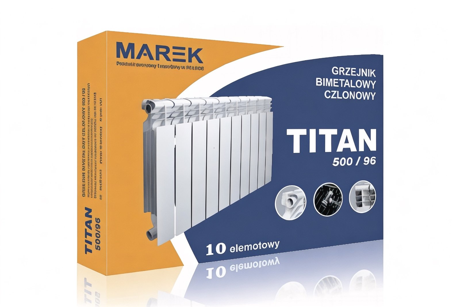 Для надійної та тривалої експлуатації біметалевих радіаторів Marek titan рекомендується використовувати оригінальні комплектуючі. Секції біметалевих радіаторів Marek Titan складається із сталевого зварного елемента, залитого під тиском алюмінієвим сплавом. Конструкція секції повністю виключає контакт теплоносія з алюмінієм. Для складання секцій в єдиний радіатор використовуються сталеві ніпелі та спеціальні паранітові прокладки, які забезпечують надійну герметичність при експлуатації з різними теплоносіями. Один з небагатьох радіаторів, що працює при тиску 60 бар. Виконані у класичному дизайні, з наявністю двох пелюсток на передній частині регістру. Мають ідеальну гладку, відшліфовану поверхню, пофарбовані у білий теплий колір.